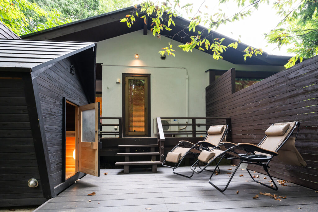 ウッドデッキを増築し、プライベート感のある薪式サウナを設えています。
